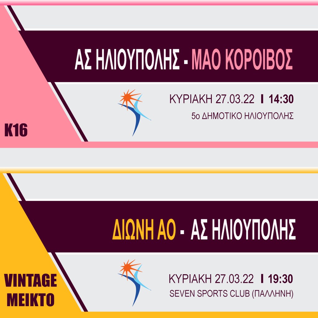▶️Κ16Η ομάδα Κ16, την Κυριακή 27/03 στις 14:30, υποδέχεται την αντίστοιχη ομάδα ΜΑΟ Κόροιβος στο κλειστό γυμναστήριο του 5ου Δημοτικού Ηλιούπολης