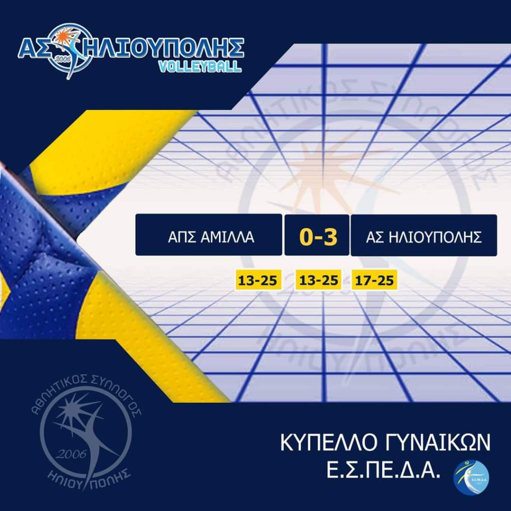 ☑️ΓΥΝΑΙΚΕΣΓια την 2η φάση του Κυπέλλου Γυναικών Ε.Σ.ΠΕ.Δ.Α. η ομάδα μας σε νοκ-αουτ αγώνα, νίκησε με 3-0 σετ την τυπικά γηπεδούχο ομάδα ΑΠΣ Άμιλλα στο Α’ Κλειστό Ηλιούπολης και πήρε την πρόκριση για την επόμενη φάση.👏▶️Τα σετ: (13-25, 13-25, 17-25)Α.Σ. ΗΛΙΟΥΠΟΛΗΣ (Γιώργος Κερκινές): Μαρίνα Καλαϊτζίεβα (αρχηγός), Άννα Παπαχρήστου, Μαριάννα Λιαρούτσου, Μυρτώ Ξοφάκη, Ειρηάνα Μαυρογένη, Έφη Κωτούλα, Άννα-Μαρία Περάκη, Καρολίνα Λάππα, Δανάη Βήχου, Δήμητρα Χειλαδάκη, Σίσσυ Κοτρώνη, Στέλλα Ντρούβα, Χριστίνα Μπογιατζή, (λ), Ειρήνη Παναγοπούλου (λ).Για την 3η φάση του Κυπέλλου, η ομάδα μας θα αντιμετωπίσει τον νικητή της αναμέτρησης ΑΟ Ιωνικός Νίκαιας – Μ.Ε.Λ.Α.Σ. Αγ. Ελευθέριος