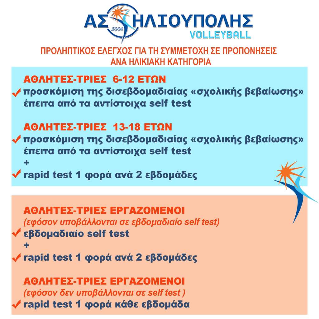 📌Σύμφωνα με το δελτίο τύπου (11/05/21) που εξέδωσε η Γ.Γ.Α. (Γενική Γραμματεία Αθλητισμού) και στο πλαίσιο της ασφαλούς επιστροφής στις αθλητικές δραστηριότητες απαιτείται προληπτικός έλεγχος των αθλητών-τριών για τη συμμετοχή στις προπονήσεις.Συγκεκριμένα, για το βόλεϊ, ανά ηλικιακή κατηγορία ισχύουν τα εξής:ΑΘΛΗΤΕΣ-ΤΡΙΕΣ 6-12 ΕΤΩΝ ☑️προσκόμιση της δισεβδομαδιαίας «σχολικής βεβαίωσης» έπειτα από τα αντίστοιχα self testΑΘΛΗΤΕΣ-ΤΡΙΕΣ 13-18 ΕΤΩΝ☑️προσκόμιση της δισεβδομαδιαίας «σχολικής βεβαίωσης» έπειτα από τα αντίστοιχα self test☑️+διενέργεια rapid test 1 φορά ανά 2 εβδομάδεςΑΘΛΗΤΕΣ-ΤΡΙΕΣ ΕΡΓΑΖΟΜΕΝΟΙ (εφόσον υποβάλλονται σε εβδομαδιαίο self test)☑️εβδομαδιαίο self test☑️+ διενέργεια rapid test 1 φορά ανά 2 εβδομάδεςΑΘΛΗΤΕΣ-ΤΡΙΕΣ ΕΡΓΑΖΟΜΕΝΟΙ (εφόσον δεν υποβάλλονται σε self test )☑️διενέργεια rapid test 1 φορά κάθε εβδομάδαΑναμένονται τα υγειονομικά πρωτόκολλα, που θα εκδοθούν τις προσεχείς ημέρες από την Γ.Γ.Α.Πηγή: https://gga.gov.gr/…/deltia-tupou/3335-2021-05-11-12-40-14