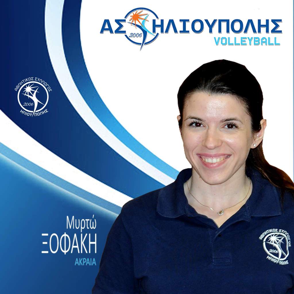 Η Μυρτώ Ξοφάκη αγωνίζεται ως ακραία και ανήκει στο δυναμικό του ΑΣ Ηλιούπολης από την αρχή της λειτουργίας του (2008). Είναι γεννημένη και μεγαλωμένη στην Ηλιούπολη και τα πρώτα της βήματα στο βόλεϊ τα έκανε στη Φιλία Ηλιούπολης.
