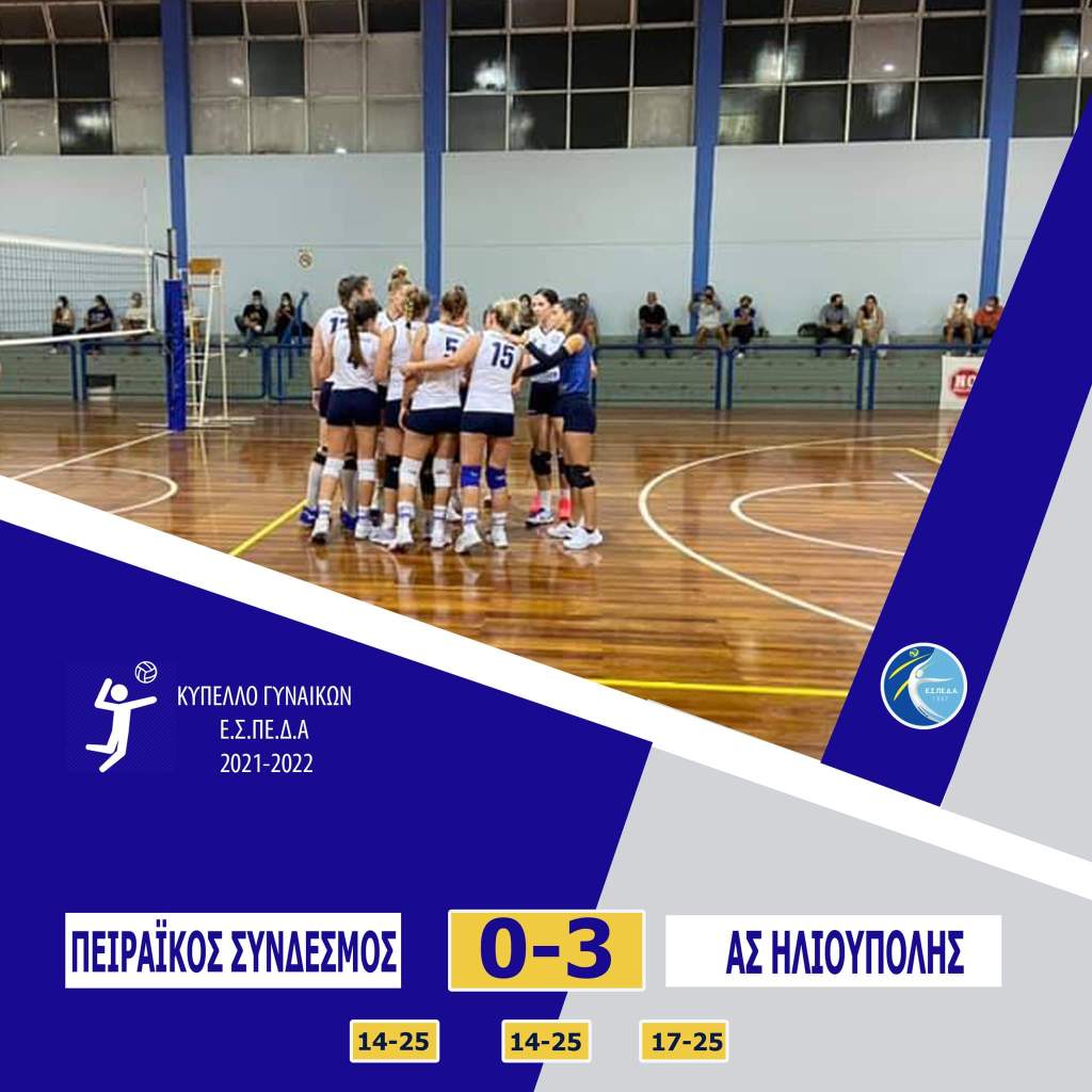 Για τη 2η φάση του Κυπέλλου Γυναικών Ε.Σ.ΠΕ.Δ.Α. η ομάδα μας, σε νοκ-αουτ αγώνα, νίκησε με 3-0 σετ στο ΔΓ Πειραιά Π. Σαλπέας την ομάδα Πειραϊκός Σύνδεσμος και πήρε την πρόκριση για την επόμενη φάση👏▶️Τα σετ: (14-25, 14-25, 17-25)Α.Σ. ΗΛΙΟΥΠΟΛΗΣ (Βασίλης Ξεροβάσιλας): Σταυρούλα Λιαρομάτη (αρχηγός), Μυρτώ Ξοφάκη, Ειρηάνα Μαυρογένη, Κασμηρία Δημητρίου, Χαρά Μπιτσάκου, Ζωή Τουρνάκη, Αγάπη Φούσκα, Δανάη Βήχου, Γρίσπου Έλσα, Ιωάννα Μανώλη (λ), Χριστίνα Μπογιατζή (λ).ℹ️ Για την 3η φάση του Κυπέλλου, η ομάδα μας θα αντιμετωπίσει τον νικητή του αγώνα ΔΑΣ Δραπετσώνας-ΑΟΠ Μοσχάτου στο Α’ Κλειστό Ηλιούπολης