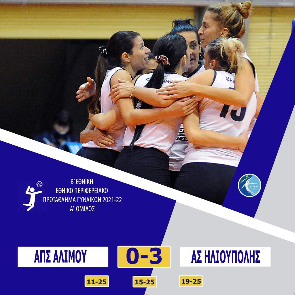 Στο πλαίσιο της 2ης αγωνιστικής της Α’ φάσης του Πρωταθλήματος Β’ Εθνικής Γυναικών, η ομάδα μας νίκησε με 3-0 σετ την ομάδα του ΑΠΣ.Αλίμου στο Κλειστό Αλίμου.▶Τα σετ: (11-25, 15-25, 19-25)Α.Σ. ΗΛΙΟΥΠΟΛΗΣ (Βασίλης Ξεροβάσιλας): Σταυρούλα Λιαρομάτη (αρχηγός), Μαριάννα Λιαρούτσου, Μελίνα Σταματέλου, Μυρτώ Ξοφάκη, Ειρηάνα Μαυρογένη, Κασμηρία Δημητρίου, Χαρά Μπιτσάκου, Ζωή Τουρνάκη, Αγάπη Φούσκα, Βάσια Κούστα-Καψάλη, Δανάη Βήχου, Γρίσπου Έλσα, Ιωάννα Μανώλη (λ), Χριστίνα Μπογιατζή, (λ).