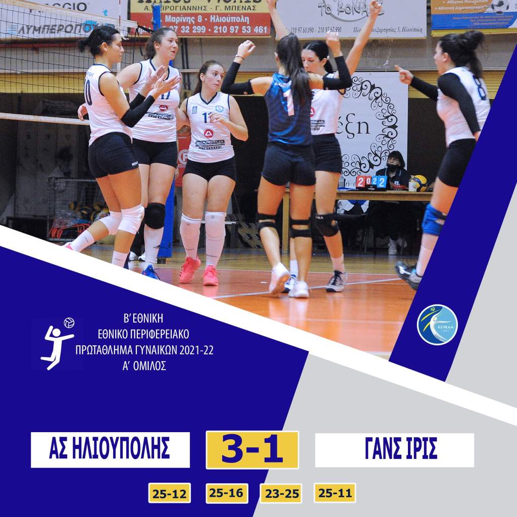 Στο πλαίσιο της 4ης αγωνιστικής της Α’ φάσης του Πρωταθλήματος Β’ Εθνικής Γυναικών, η ομάδα μας νίκησε με 3-1 σετ την ομάδα ΓΑΝΣ Ίρις στο Α’ Κλειστό Ηλιούπολης. 👏 ▶Τα σετ: (25-12, 25-16, 23-25, 25-11)Α.Σ. ΗΛΙΟΥΠΟΛΗΣ (Βασίλης Ξεροβάσιλας): Σταυρούλα Λιαρομάτη (αρχηγός), Μαριάννα Λιαρούτσου, Μελίνα Σταματέλου, Μυρτώ Ξοφάκη, Ειρηάνα Μαυρογένη, Κασμηρία Δημητρίου, Χαρά Μπιτσάκου, Ζωή Τουρνάκη, Αγάπη Φούσκα, Βάσια Κούστα-Καψάλη, Δανάη Βήχου, Γρίσπου Έλσα, Ιωάννα Μανώλη (λ), Χριστίνα Μπογιατζή, (λ).