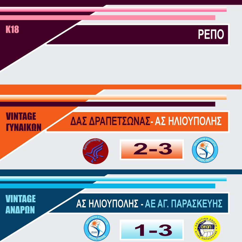▶️Κ18Ρεπό στην 1η αγωνιστική του 2ου γύρου είχε η ομάδα Κ18. ▶️ VINTAGE ΓΥΝΑΙΚΕΣΓια την 3η αγωνιστική της Α’ φάσης του πρωταθλήματος VINTAGE Γυναικών, η ομάδα μας σε έναν αγώνα που κρίθηκε στο tie break πήρε τη νίκη με 3-2 σετ από την αντίστοιχη ομάδα ΔΑΣ Δραπετσώνας στο Κλειστό Δραπετσώνας «Γ. Κασιμάτης». ▶Τα σετ: (25-20, 23-25, 23-25, 28-26, 4-15)Α.Σ. ΗΛΙΟΥΠΟΛΗΣ (Ρίτα Κάψου) : Μαρκέλα Θεοδώρου (αρχηγός), Αναστασία Πολυχρονοπούλου, Μαρία Λαγού, Λία Σούσουλα, Εύη Αγγελή, Βάνα Σιάτρα, Aθηνά Ζώη, Δέσποινα Δραγατζίκη, Βαρβάρα Νικητίδου, Ελένη Κορρέ, Άντζελα Τσιβγά (λ), Κατερίνα Παπαζή(λ). ▶️ VINTAGE ΑΝΔΡΕΣΓια την 2η αγωνιστική της Α’ φάσης του πρωταθλήματος VINTAGE Ανδρών, η ομάδα μας ηττήθηκε με 3-1 σετ από την αντίστοιχη ομάδα ΑΕ Αγ. Παρασκευής στο κλειστό γυμναστήριο του 5ου Δημοτικού Ηλιούπολης. ▶Τα σετ: (17-25, 25-20, 21-25, 15-25)Α.Σ. ΗΛΙΟΥΠΟΛΗΣ (Βασίλης Ξεροβάσιλας) : Αλέξανδρος Καραγκούνης (αρχηγός), Δημήτρης Αλτιπαμαρκ, Βασίλης Έξαρχος, Δράκος Αχιλλέας, Αργύρης Σπύρου, Γιάννης Μπαϊρακτάρης, Γιάννης Κουρσάρης, Αλέξανδρος Στάικος, Στέλιος Κούνης, Βαγγέλης Αναγνωστόπουλος, Μπάμπης Κορκόβελος, Νίκος Σπύρου(λ).