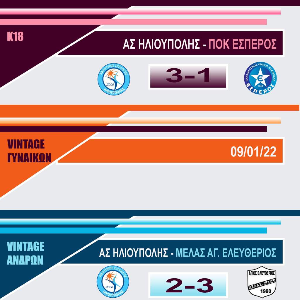 ▶️Κ18Για την 10η αγωνιστική της Α’ Φάσης του πρωταθλήματος Κ18, η ομάδα μας πήρε τη νίκη με 3-1 σετ επί της ομάδας ΠΟΚ Έσπερος στο κλειστό γυμναστήριο του 5ου Δημοτικού Ηλιούπολης τερματίζοντας στην 1η θέση του Γ’ Ομίλου.👏💙▶Τα σετ: (25-16, 25-20, 20-25, 25-21) ΑΣ ΗΛΙΟΥΠΟΛΗΣ (Έλσα Γρίσπου) : Σίσσυ Κοτρώνη (αρχηγός), Αρετή Παπαδοθωμάκου, Σταυρούλα Κάτση, Μελίνα Κουλόικα, Αννίτα Μουσιώλη, Ιωάννα Κακατσίδα, Φωτεινή Εμμανουήλ, Εύα Καμπουράκη, Ευαγγελία Δουδωνή, Ελίνα Τραγουδάρα, Αγάπη Χριστοπούλου, Σέβη Γιαννοπούλου, Στέλλα Ντρούβα(λ), Ζωή Δράκου (λ).☑️VINTAGE ΓΥΝΑΙΚΕΣΗ ομάδα VINTAGE Γυναικών για την 7η αγωνιστική του 1ου γύρου θα αγωνιστεί στις 09/01/22.
