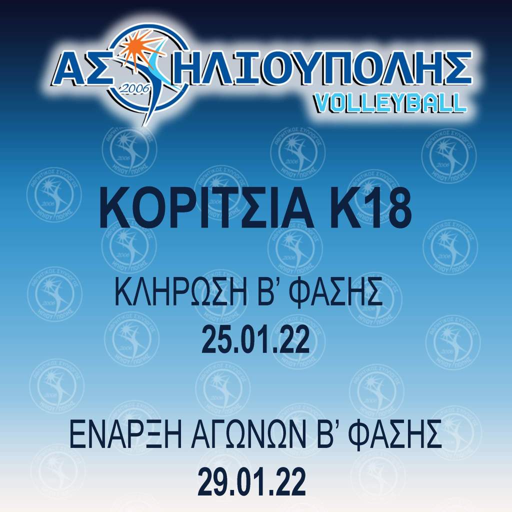 Την Τρίτη 25/01/22 θα γίνει η κλήρωση για τη Β΄ Φάση του Πρωταθλήματος Κ18. Στη Β΄ Φάση έχουν προκριθεί οι παρακάτω ομάδες Ως 1οι : ΑΣ ΗΛΙΟΥΠΟΛΗΣ, ΜΑΟ ΚΟΡΟΙΒΟΣ, ΑΟ ΣΕΙΡΙΟΣ ΑΣΠΡΟΠΥΡΓΟΥ, ΑΠΣ ΑΡΗΣ ΑΜΦΙΑΛΗΣ. Ως 2οι : ΑΕ ΕΥΡΥΠΙΔΗΣ, ΑΕ ΙΚΑΡΟΣ ΚΑΛΛΙΘΕΑΣ, ΑΠΣ ΑΜΙΛΛΑ, ΓΑΝΣ ΙΡΙΣ και οι : ΓΑΣ ΙΑΣΟΝΑΣ, ΓΣ ΙΛΙΟΥ, ΑΟ ΚΕΛΕΟΣ, ΑΣ ΕΥΚΛΕΙΔΗΣ, ΠΟΚ ΕΣΠΕΡΟΣ, ΑΡΜΕΝΙΚΗ ΠΕΙΡΑΙΩΣ, ΠΕΙΡΑΪΚΟΣ ΣΥΝΔΕΣΜΟΣ, ΑΦΜΣ ΦΟΙΝΙΞ. Η έναρξη των αγώνων θα είναι από 29/01/22