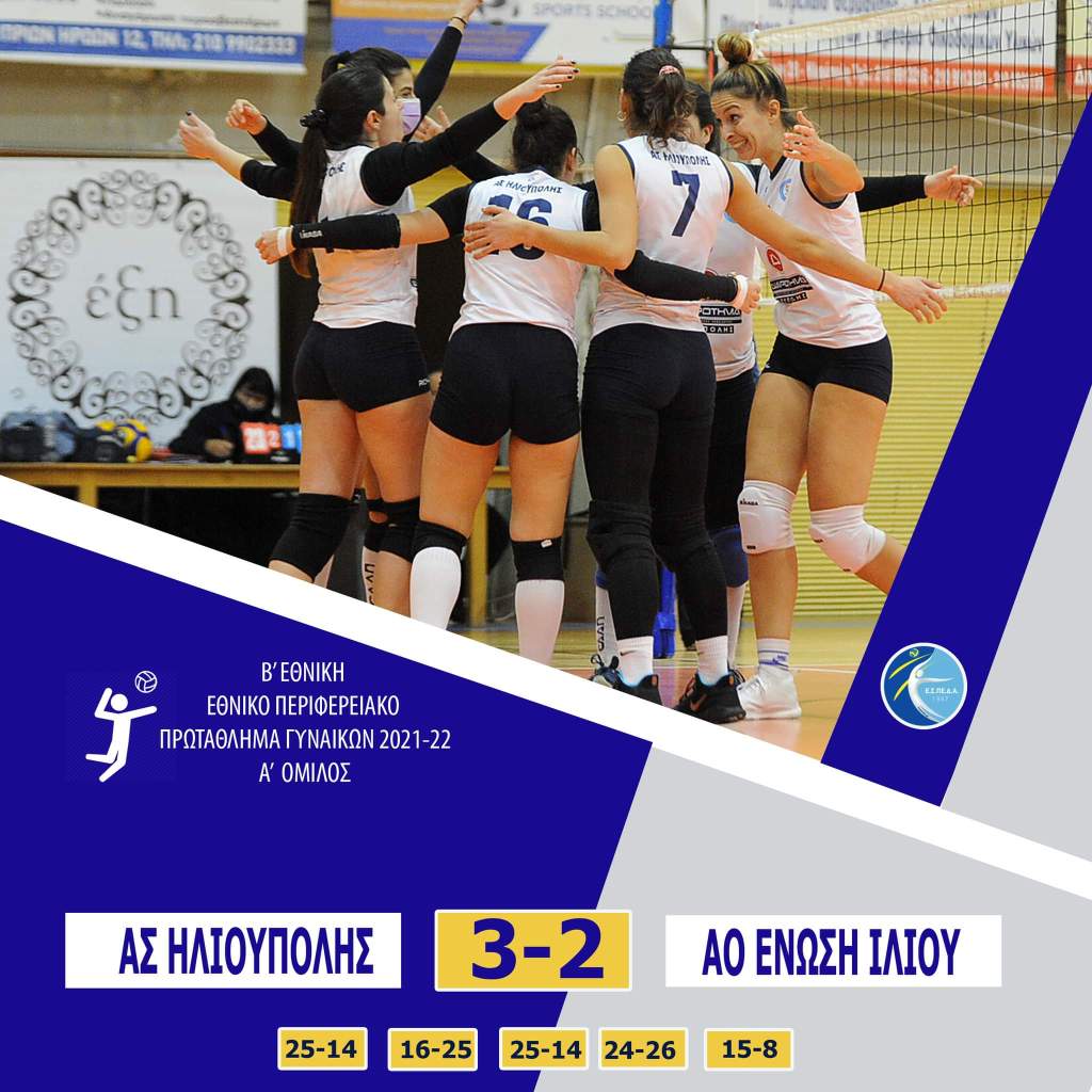☑️ΓΥΝΑΙΚΕΣΣτο πλαίσιο της 14ης αγωνιστικής και τελευταίας της Α’ φάσης του Πρωταθλήματος Β’ Εθνικής Γυναικών, η ομάδα μας σε έναν αγώνα που κρίθηκε στο tie break πήρε τη νίκη με 3-2 σετ από την ομάδα ΑΟ Ένωση Ιλίου στο Α’ Κλειστό Ηλιούπολης, τερματίζοντας στη 2η θέση του Α’ Ομίλου. 👏💙 ▶Τα σετ: (25-14, 16-25, 25-14, 24-26 15-8)Α.Σ. ΗΛΙΟΥΠΟΛΗΣ (Βασίλης Ξεροβάσιλας): Μυρτώ Ξοφάκη(αρχηγός), Μαριάννα Λιαρούτσου, Μελίνα Σταματέλου, Ειρηάνα Μαυρογένη, Ιωάννα Γωγούσου, Χαρά Μπιτσάκου, Ζωή Τουρνάκη, Σταυρούλα Λιαρομάτη, Δήμητρα Μαλατρά, Έλσα Γρίσπου, Έρη Αλεξοπούλου, Δανάη Βήχου, Ιωάννα Μανώλη (λ).