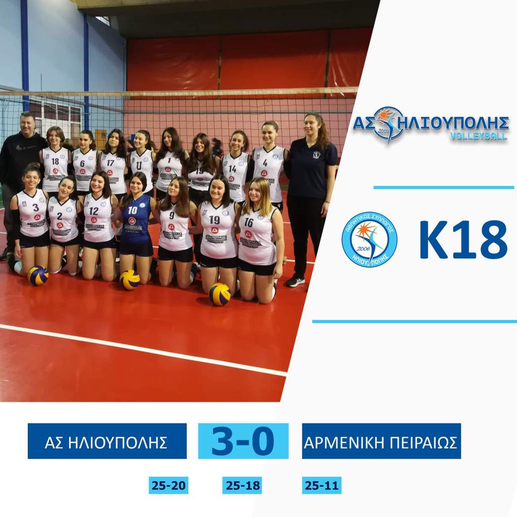 ☑️Κ18Για την 3η αγωνιστική της Β’ Φάσης του πρωταθλήματος Κ18, η ομάδα μας πήρε τη νίκη με 3-0 σετ επί της ομάδας ΑΡΜΕΝΙΚΗ Πειραιώς στο κλειστό του 5ου Δημοτικού Ηλιούπολης. 👏💙▶️Τα σετ: (25-20, 25-18, 25-11) ΑΣ ΗΛΙΟΥΠΟΛΗΣ (Έλσα Γρίσπου) : Σίσσυ Κοτρώνη (αρχηγός), Αρετή Παπαδοθωμάκου, Σταυρούλα Κάτση, Αννίτα Μουσιώλη, Μελίνα Κουλόικα, Εύα Καμπουράκη, Ευαγγελία Δουδωνή, Αλεξία Παπαθανασίου, Ελίνα Τραγουδάρα, Ζωή Δράκου, Σέβη Γιαννοπούλου, Αγάπη Χριστοπούλου, Φωτεινή Εμμανουήλ (λ), Στέλλα Ντρούβα(λ).