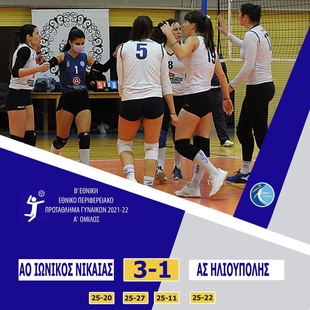 ☑️ΓΥΝΑΙΚΕΣΣτο πλαίσιο της 1ης αγωνιστικής της Β’ φάσης (Θέσεις 1-8) του Πρωταθλήματος Β’ Εθνικής Γυναικών, η ομάδα μας ηττήθηκε με 3-1 σετ από την ομάδα ΑΟ Ιωνικός Νίκαιας στο 1ο Κλειστό Νίκαιας (Σελπίτσαρι). ▶Τα σετ: (25-20, 25-27, 25-11, 25-22)Περαστικά και γρήγορη επιστροφή στα γήπεδα στην αθλήτριά μας Ιωάννα Μανώλη #1, η οποία τραυματίστηκε κατά τη διάρκεια του 3ου σετ 🙏 💙Συγχαρητήρια σε όλες τις αθλήτριες για την προσπάθεια που κατέβαλαν, ιδιαίτερα μετά και τον τραυματισμό της Ιωάννας. 👏Α.Σ. ΗΛΙΟΥΠΟΛΗΣ (Βασίλης Ξεροβάσιλας): Μυρτώ Ξοφάκη(αρχηγός), Μαριάννα Λιαρούτσου, Ειρηάνα Μαυρογένη, Ιωάννα Γωγούσου, Χαρά Μπιτσάκου, Ζωή Τουρνάκη, Αγάπη Φούσκα, Δήμητρα Μαλατρά, Έλσα Γρίσπου, Έρη Αλεξοπούλου, Δανάη Βήχου, Ιωάννα Μανώλη (λ). Τα υπόλοιπα αποτελέσματα της 1ης αγωνιστικής (Θέσεις 1-8) :☑ Μ.Ε.Λ.Α.Σ ΑΓ.ΕΛΕΥΘΕΡΙΟΣ-ΑΟ ΕΝΩΣΗ ΙΛΙΟΥ 1-3 (16-25, 22-25, 25-23, 27-29)☑ ΑΣΠ ΓΛΥΦΑΔΑ-ΓΑΝΣ ΙΡΙΣ 3-0 (25-14, 25-23, 25-20)☑ ΑΟ ΘΡΙΑΜΒΟΣ-ΑΟ Π. ΦΑΛΗΡΟΥ 2-3 (13-25, 26-24,17-25, 25-23,15-17)