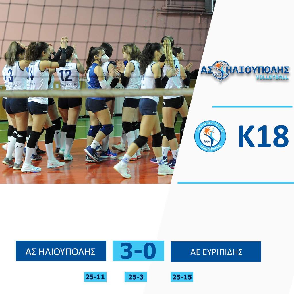 ☑️Κ18🥳NIKH & ΠΡΟΚΡΙΣΗ ΣΤΟ FINAL 4!!! 🤩🎉Για την 5η αγωνιστική της Β’ Φάσης του πρωταθλήματος Κ18, η ομάδα μας πήρε τη νίκη με 3-0 σετ επί της ομάδας ΑΕ ΕΥΡΙΠΙΔΗΣ στο κλειστό του 5ου Δημοτικού Ηλιούπολης εξασφαλίζοντας τη συμμετοχή της στο Final 4 της κατηγορίας τους.Συγχαρητήρια σε όλες τις αθλήτριες και στην προπονήτριά τους! 👏💙▶️Τα σετ: (25-11, 25-3, 25-15) ΑΣ ΗΛΙΟΥΠΟΛΗΣ (Έλσα Γρίσπου) : Σίσσυ Κοτρώνη (αρχηγός), Αρετή Παπαδοθωμάκου, Σταυρούλα Κάτση, Αννίτα Μουσιώλη, Μελίνα Κουλόικα, Εύα Καμπουράκη, Ευαγγελία Δουδωνή, Αλεξία Παπαθανασίου, Ελίνα Τραγουδάρα, Ζωή Δράκου, Σέβη Γιαννοπούλου, Αγάπη Χριστοπούλου, Φωτεινή Εμμανουήλ (λ), Στέλλα Ντρούβα(λ).