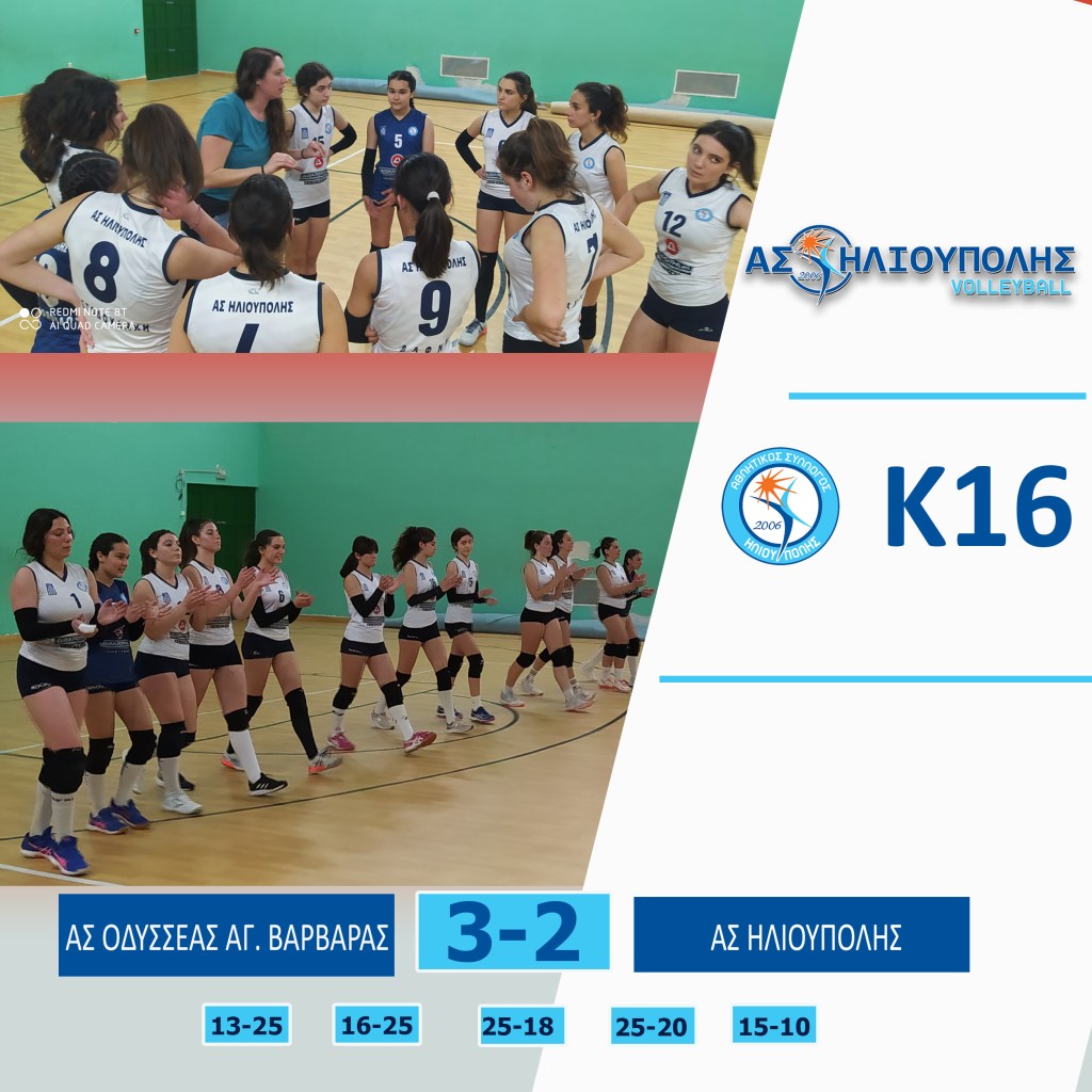 Για την 8η αγωνιστική του πρωταθλήματος Κ16, η ομάδα μας ηττήθηκε με 3-2 σετ από την αντίστοιχη ομάδα ΑΣ Οδυσσέας Αγ. Βαρβάρας στο Κλειστό Ολυμπιονίκη Μαρίας-Ελένης Κορδαλή.