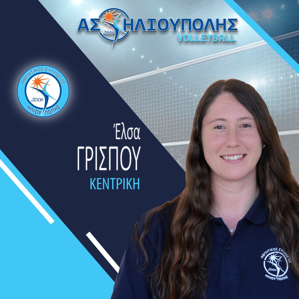 Ο ΑΣ Ηλιούπολης ανακοινώνει την ανανέωση της συνεργασίας του για δεύτερη χρονιά με την Έλσα Γρίσπου, η οποία αγωνίζεται στη θέση του κεντρικού.