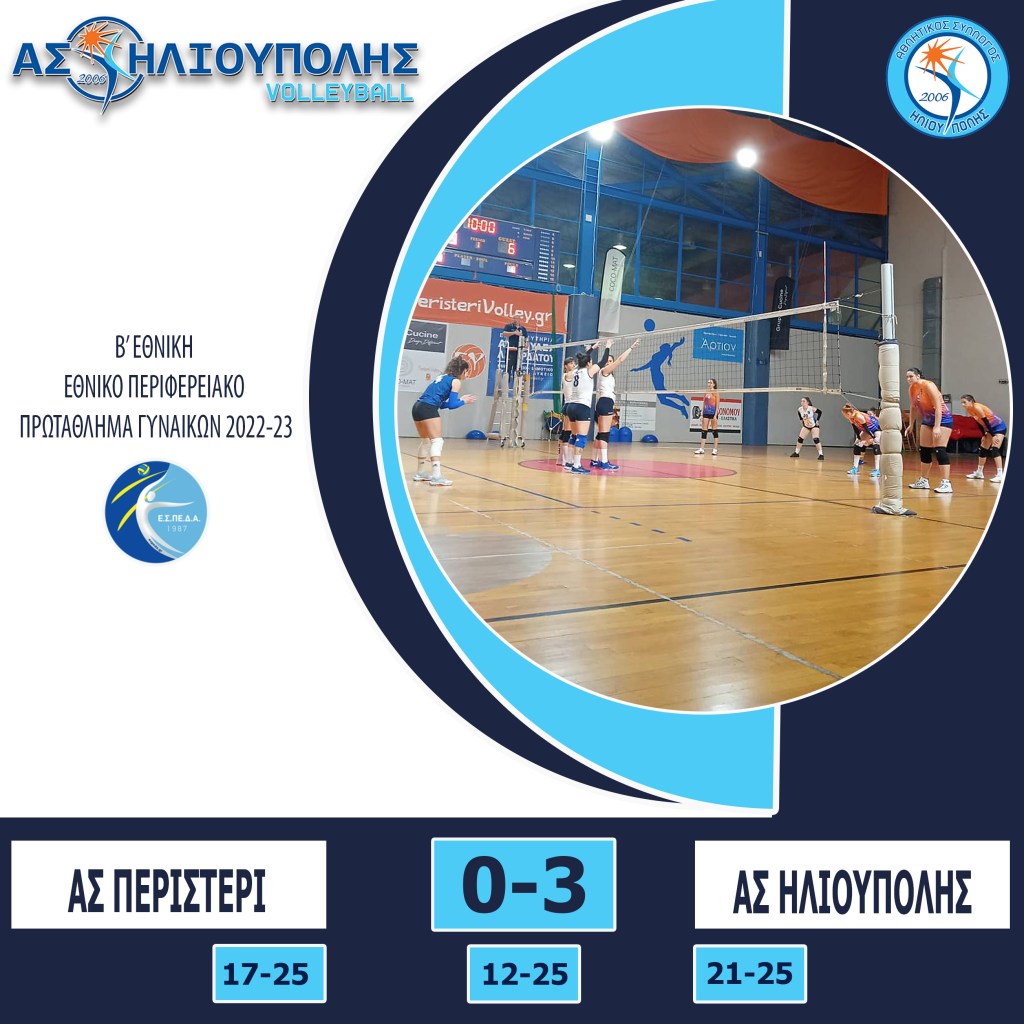 Στο πλαίσιο της 2ης αγωνιστικής του Πρωταθλήματος Β’ Εθνικής Γυναικών, η ομάδα μας πήρε τη νίκη με 3-0 σετ από την ομάδα ΑΣ Περιστέρι στο Κλειστό «Δίδυμα Χωράφας». ![]()