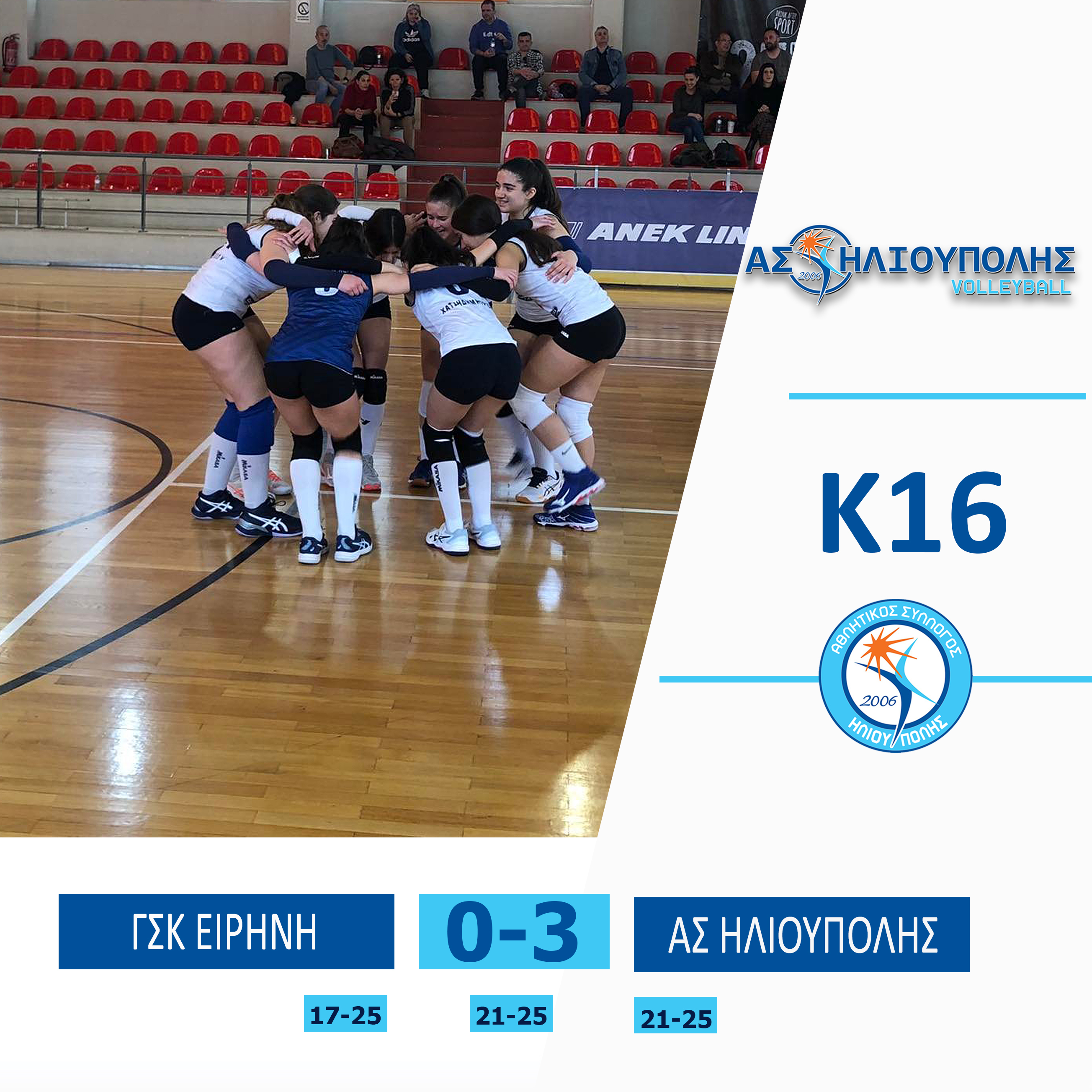 Για τη 2η αγωνιστική της Β’ Φάσης του πρωταθλήματος Κ16, η ομάδα μας πήρε τη νίκη με 3-0 σετ επί της αντίστοιχης ομάδας ΓΣΚ Ειρήνη στο Νέο Κλειστό Κορυδαλλού.👏💙
