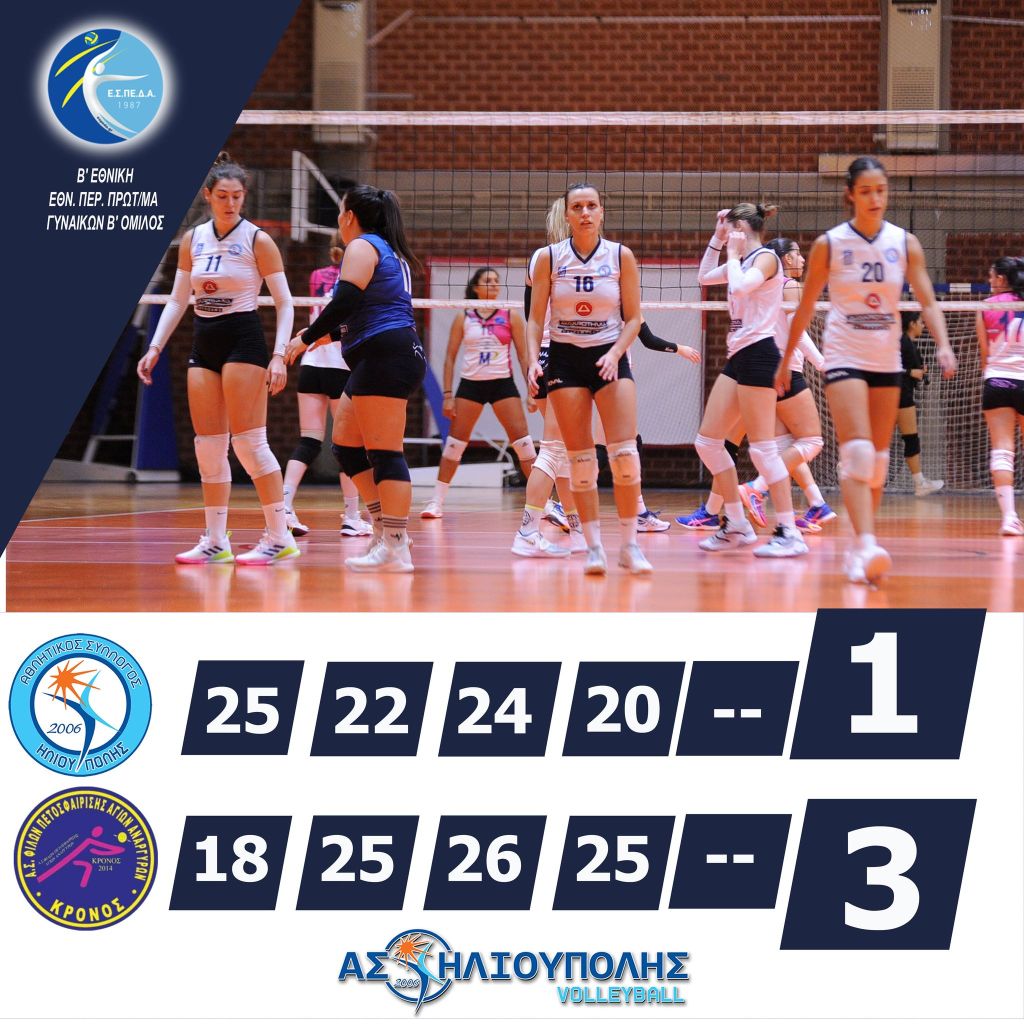 Στο πλαίσιο της 1ης αγωνιστικής του Πρωταθλήματος Β’ Εθνικής Γυναικών, η ομάδα μας γνώρισε την ήττα με 3-1 σετ από την αντίστοιχη ομάδα ΑΣΦΠ Κρόνος Αγ. Αναργύρων στο Α’ Κλειστό Ηλιούπολης.
