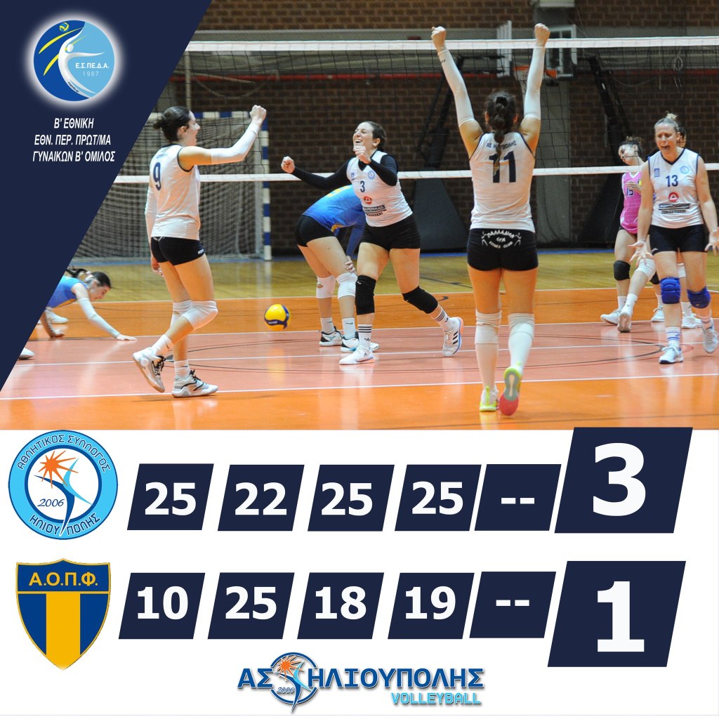Στο πλαίσιο της 7ης αγωνιστικής του Πρωταθλήματος Β’ Εθνικής Γυναικών, η ομάδα μας, επικράτησε με 3-1 σετ της αντίστοιχης ομάδας ΑΟ Π. Φαλήρου στο Α’ Κλειστό Ηλιούπολης.
