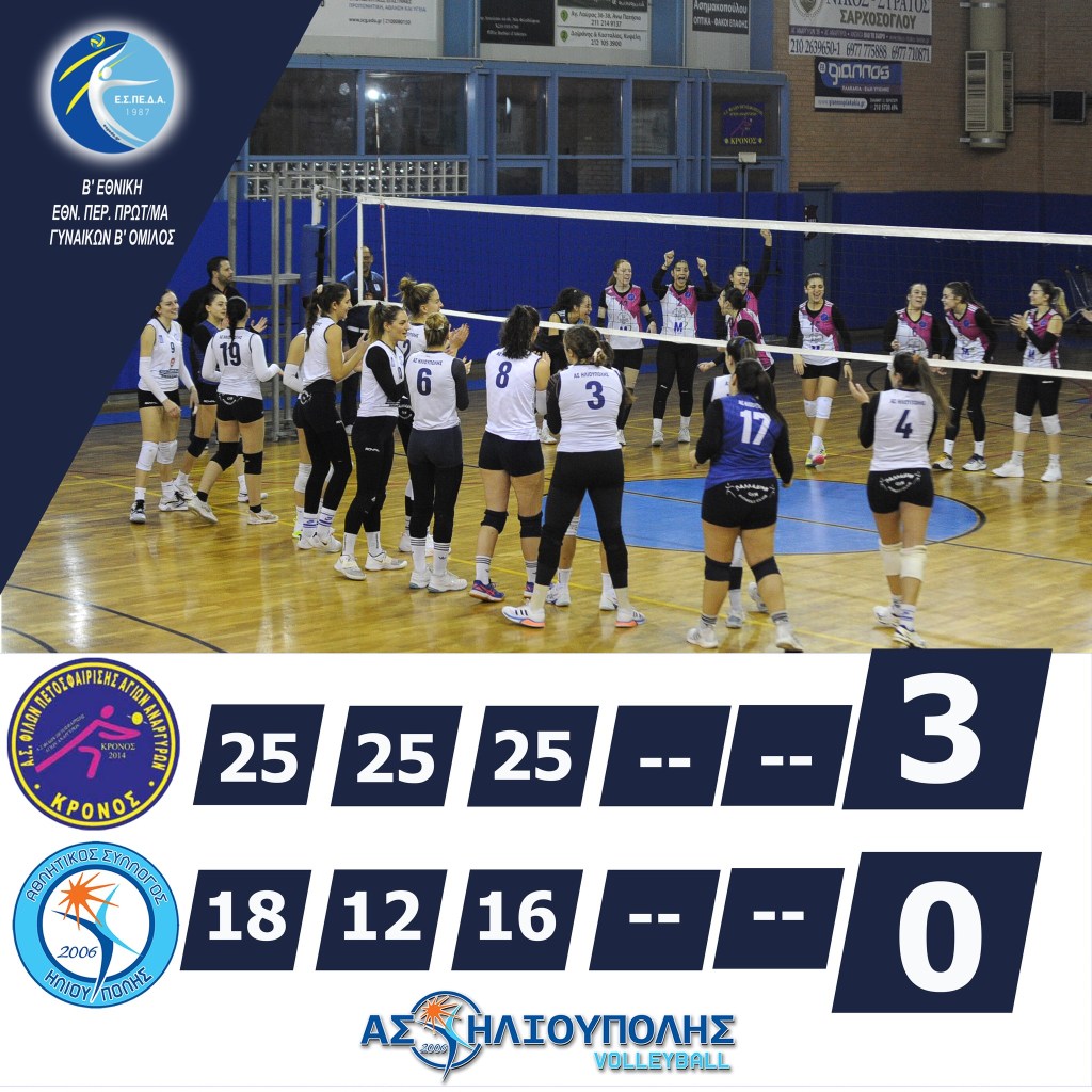 Στο πλαίσιο της 12ης αγωνιστικής του Πρωταθλήματος Β’ Εθνικής Γυναικών, η ομάδα μας ηττήθηκε με 3-0 σετ από την αντίστοιχη ομάδα ΑΣΦΠ Κρόνος Αγ. Αναργύρων στο Κλειστό Αγ. Αναργύρων.