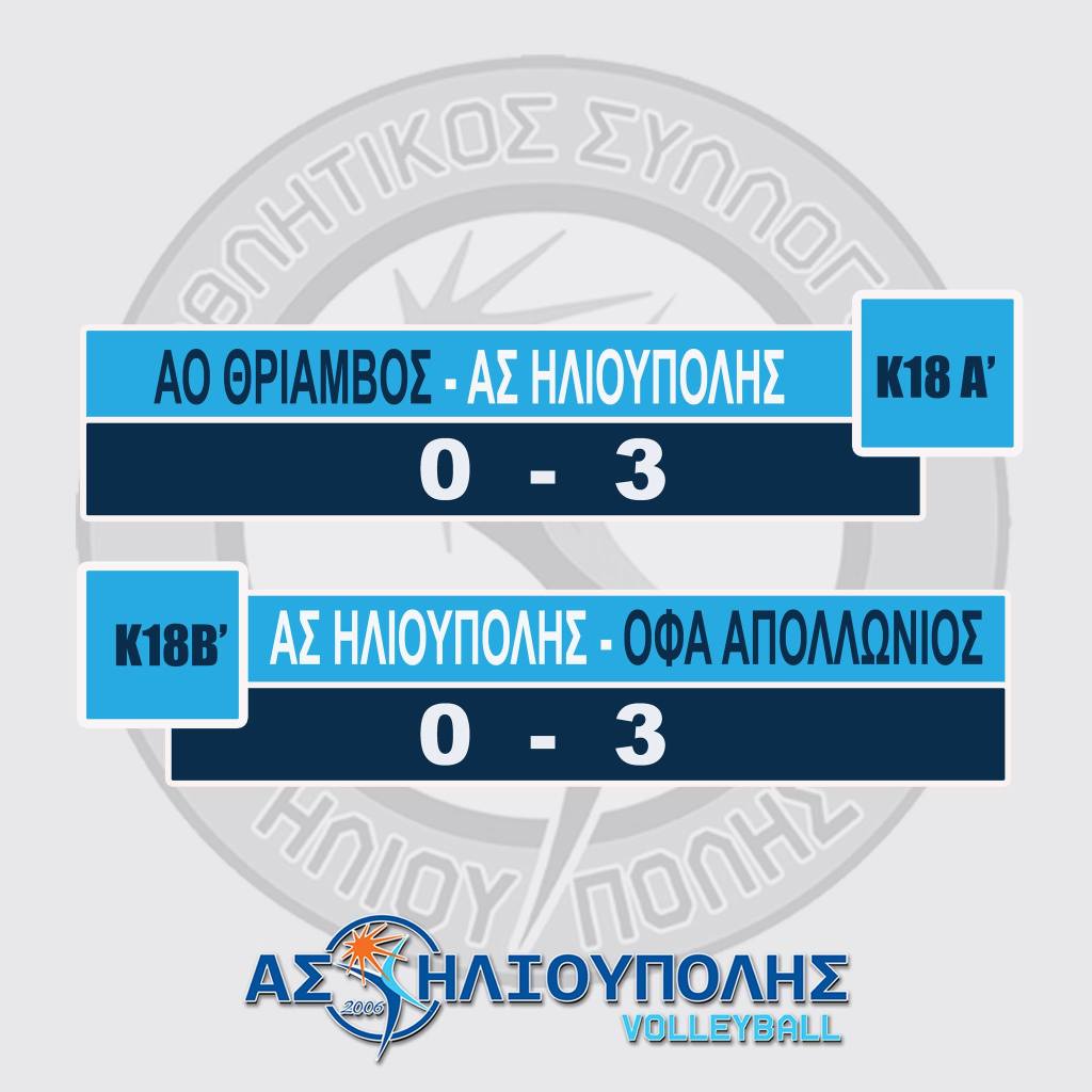 Για την 9η και τελευταία αγωνιστική των αγώνων κατάταξης (θέσεις 21-30) του πρωταθλήματος Κ18 Β’, η ομάδα μας γνώρισε την ήττα με 3-0 σετ από την αντίστοιχη ομάδα ΟΦΑ Απολλώνιος στο κλειστό του 5ου Δημοτικού Ηλιούπολης.