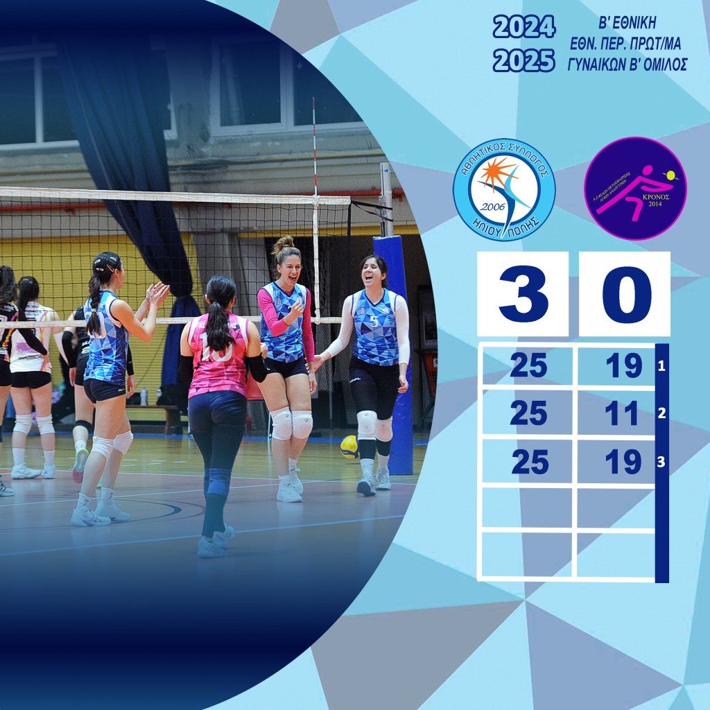 Στο πλαίσιο της 18ης αγωνιστικής του Πρωταθλήματος Β’ Εθνικής Γυναικών, η ομάδα μας επικράτησε με 3-0 σετ επί της αντίστοιχης ομάδας ΑΣΦΠ Κρόνος Αγ. Αναργύρων στο Α’ Κλειστό Ηλιούπολης.