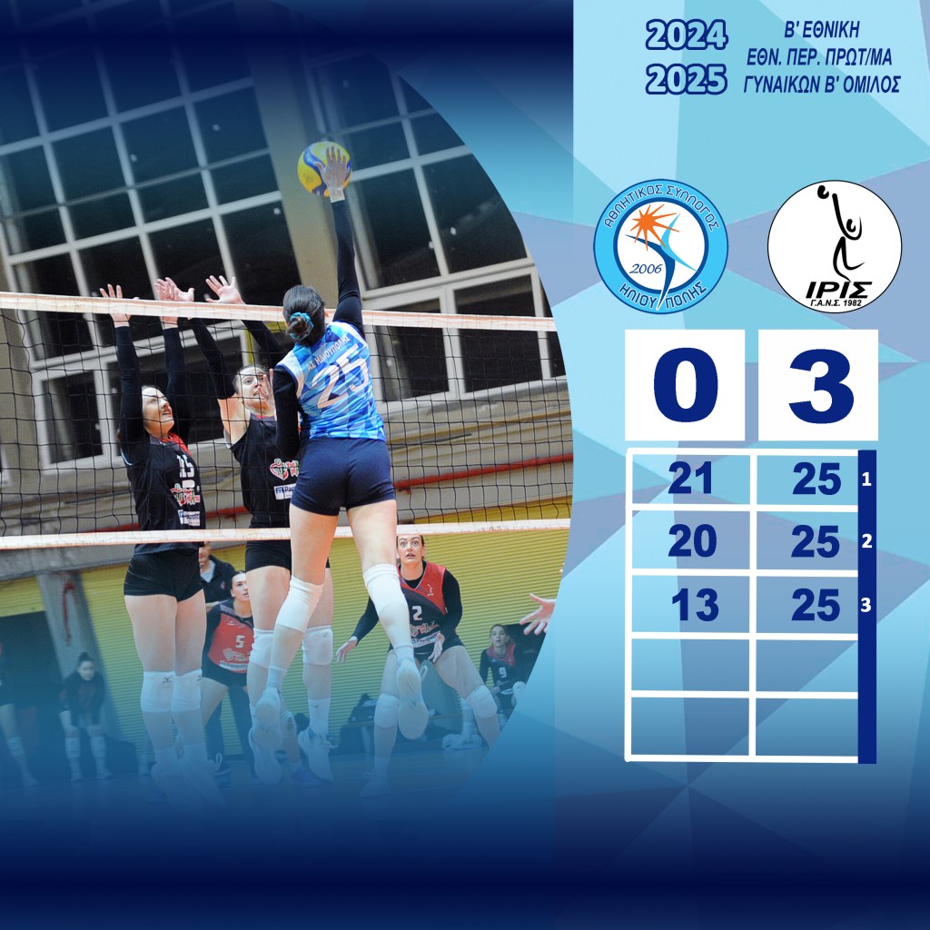 Στο πλαίσιο της 22ης και τελευταίας αγωνιστικής του Πρωταθλήματος Β’ Εθνικής Γυναικών, η ομάδα μας ηττήθηκε με 3-0 σετ από την ομάδα ΓΑΝΣ Ίρις στο Α’ Κλειστό Ηλιούπολης.