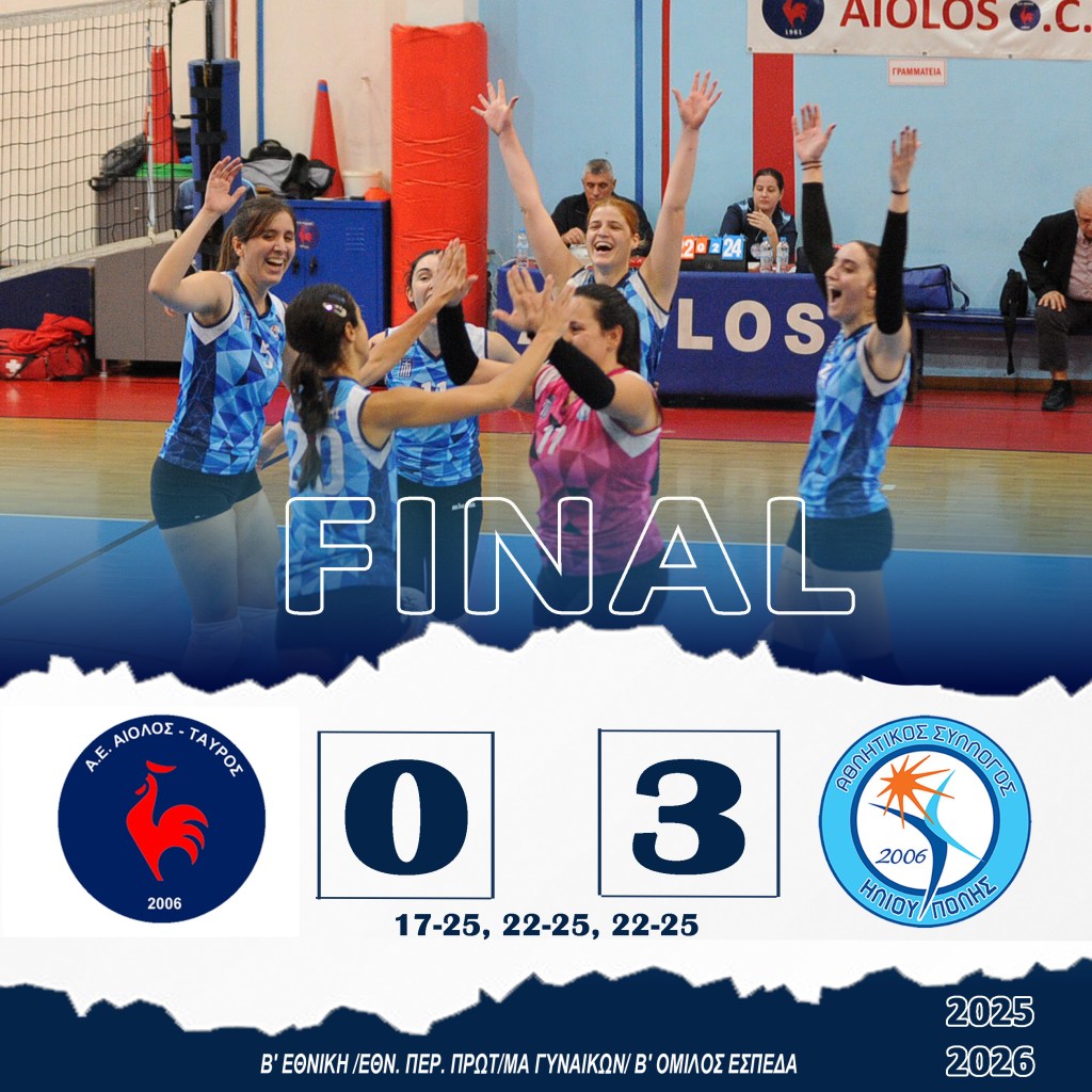 Στο πλαίσιο της 6ης αγωνιστικής του Πρωταθλήματος Β’ Εθνικής Γυναικών, η ομάδα μας, επικράτησε με 3-0 σετ επί της αντίστοιχης ομάδας ΑΕ Αίολος Ταύρος στο κλειστό Ταύρου «Τιμ. Ευγενικός». 👏💙