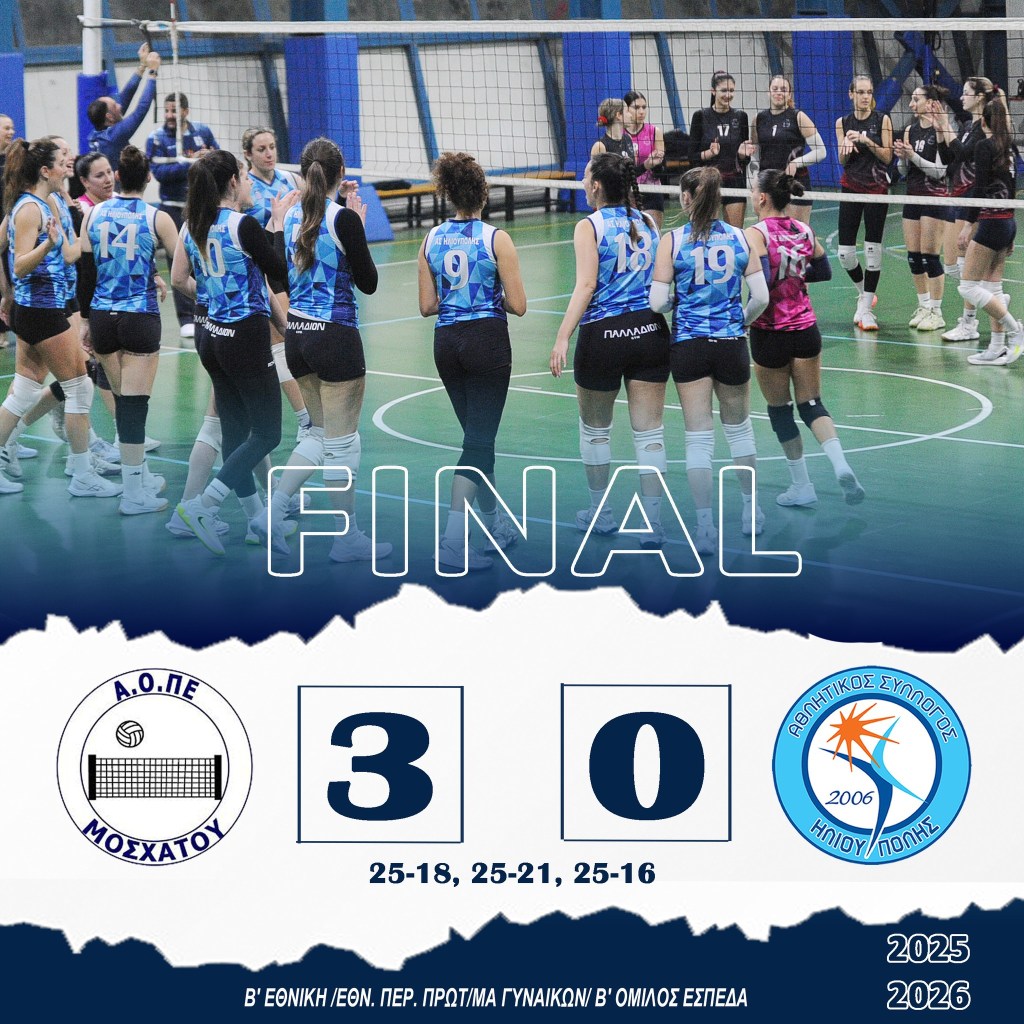 Στο πλαίσιο της 20ης αγωνιστικής του Πρωταθλήματος Β’ Εθνικής Γυναικών, η ομάδα μας, ηττήθηκε με 3-0 σετ από την αντίστοιχη ομάδα ΑΟΠ Μοσχάτου στο Νέο Κλειστό Μοσχάτου.
