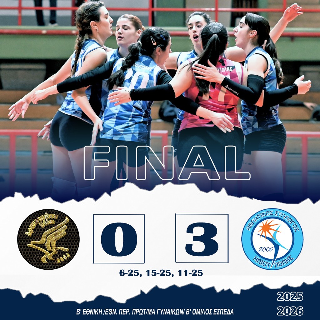 Στον εξ’ αναβολής αγώνα της 14ης αγωνιστικής του Πρωταθλήματος Β’ Εθνικής Γυναικών, η ομάδα μας, πήρε τη νίκη με 3-0 σετ απέναντι στην αντίστοιχη ομάδα ΔΑΣ Δραπετσώνας στο Κλειστό Δραπετσώνας «Γ. Κασιμάτης»